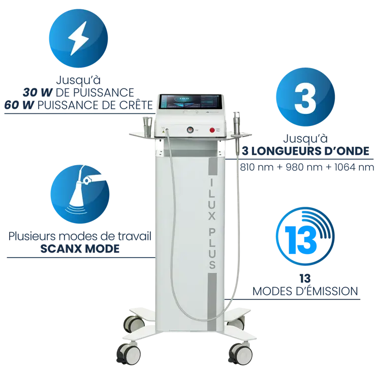 Fruit du savoir-faire technologique de plus de 40 ans de travail, iLux PLUS est la nouvelle référence de la thérapie laser. Grâce aux nombreuses configurations possibles et à la possibilité de pouvoir personnaliser facilement la thérapie avec les nombreux outils à votre disposition, iLux PLUS est votre meilleur allié pour traiter rapidement et efficacement de nombreuses pathologies.