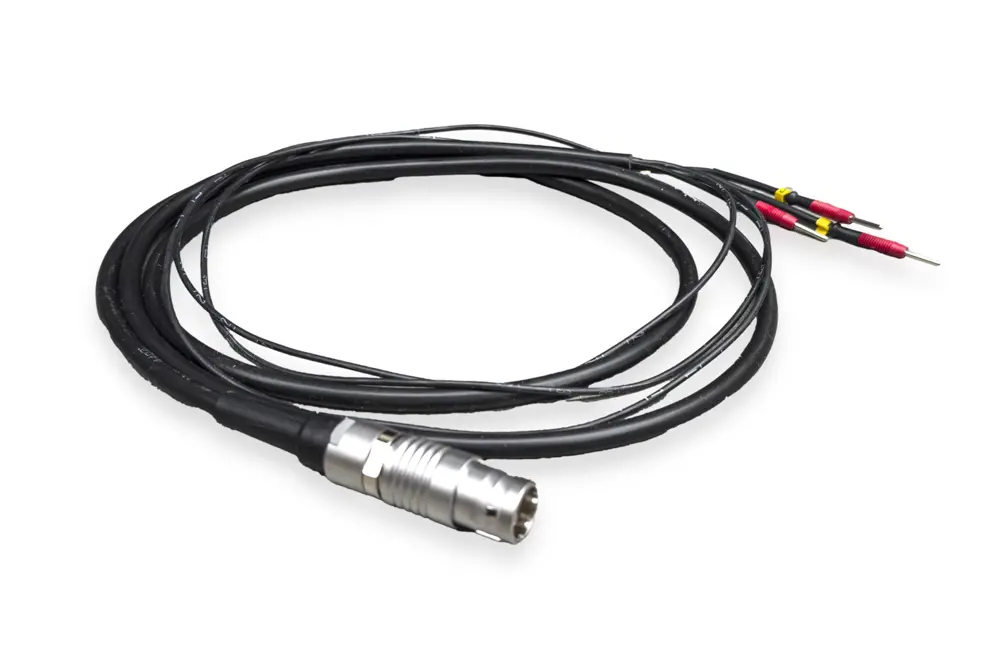 Cavo per modalità automatica AvX, dotato di tre possibili connessioni per gli elettrodi. L'attacco è compatibile con elettrodi maschio-femmina o a coccodrillo, garantendo versatilità e facilità di utilizzo durante i trattamenti.